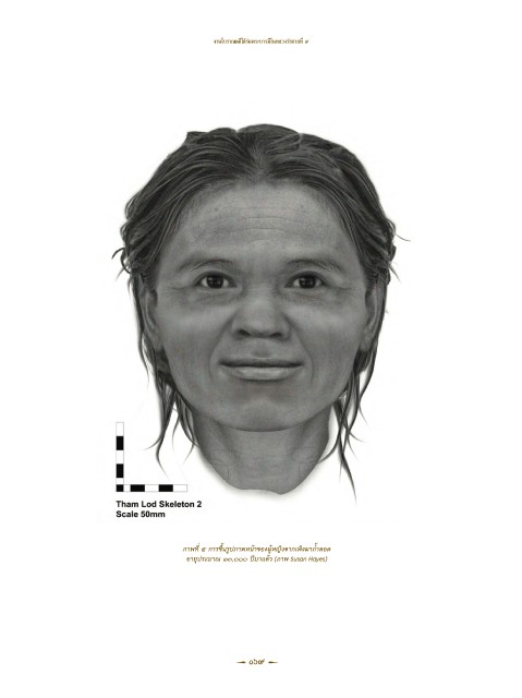 งานโบราณคดีใต้ร่มพระบารมีในหลวงรัชกาลที่ ๙ ภาพที่ ๕ การขึ้นรูปภาพหน้าของผู้หญิงจากเพิงผาถ�้าลอด อายุประมาณ ๑๓,๐๐๐ ปีมาแล้ว (ภาพ Susan Hayes) 169 ๑๖๙