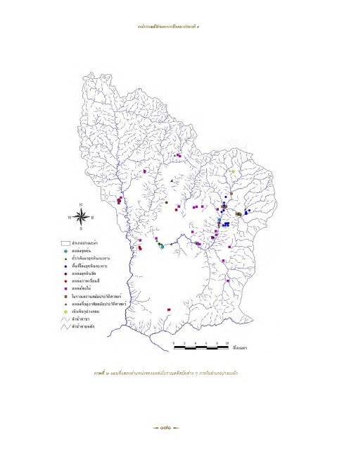งานโบราณคดีใต้ร่มพระบารมีในหลวงรัชกาลที่ ๙ ภาพที่ ๖ แผนที่แสดงต�าแหน่งของแหล่งโบราณคดีสมัยต่าง ๆ ภายในอ�าเภอปางมะผ้า 171 ๑๗๑