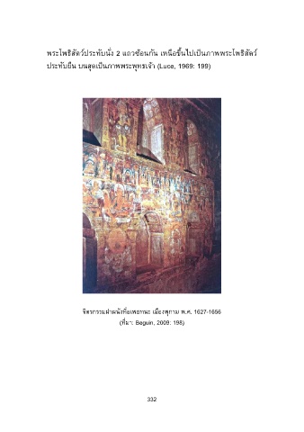พระโพธิสัตว์ประทับนั่ง 2 แถวซ้อนกัน เหนือขึ้นไปเป็นภาพพระโพธิสัตว์ ประทับยืน บนสุดเป็นภาพพระพุทธเจ้า (Luce, 1969: 199) จิตรกรรมฝาผนังที่อเพยทนะ เมืองพุกาม พ.ศ. 1627-1656 (ที่มา: Beguin, 2009: 198) 332