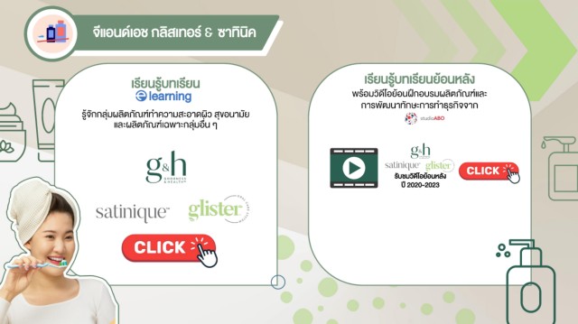 จีแอนด์เอช กลิสเทอร์ ซาทินิค เรียนรู้บทเรียน เรียนรู้บทเรียนย้อนหลัง learning พร้อมวิดีโอย้อนฝึกอบรมผลิตภัณฑ์และ การพัฒนาทักษะการท าธุรกิจจาก รู้จักกลุ่มผลิตภัณฑ์ท าความสะอาดผิว สุขอนามัย และผลิตภัณฑ์เฉพาะกลุ่มอื่น ๆ รับชมวิดีโอย้อนหลัง ปี 2020-2023