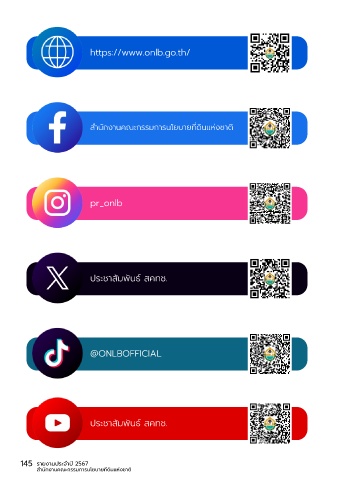 https://www.onlb.go.th/ สำำานักงานคณะกรรมการนโยบายที่่�ดิินแห่่งชาติิ pr_onlb ปีระชาสำัมพันธ์ สำคที่ช. @ONLBOFFICIAL ปีระชาสำัมพันธ์ สำคที่ช. 145 รายงานประจำาปี 2567 สำานักงานคณะกรรมการนโยบายที่ดินแห่งชาติ