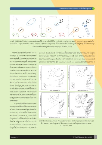 ออกมาได้อีก 1 กลุ่ม (วงกลมสีด�า) รวมเป็น 5 กลุ่ม (C) จุดที่กระจายอยู่นอกกลุ่มที่มีความกระจุกตัวน้อยกว่าจะถูกจัดให้อยู่ในกลุ่มที่มีค่าความกระจุก